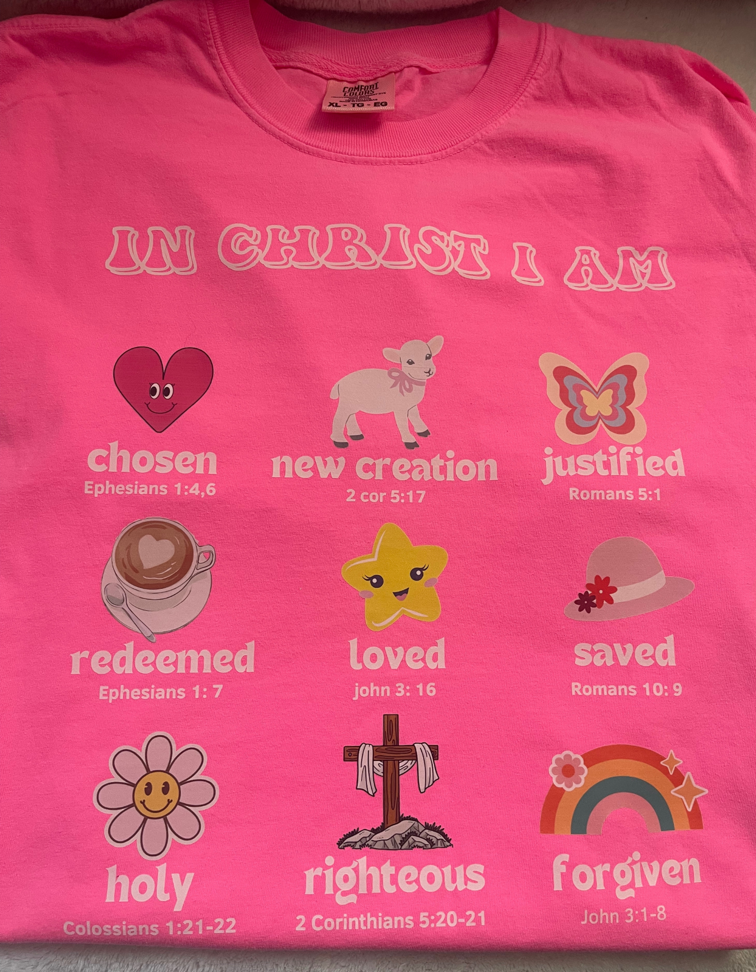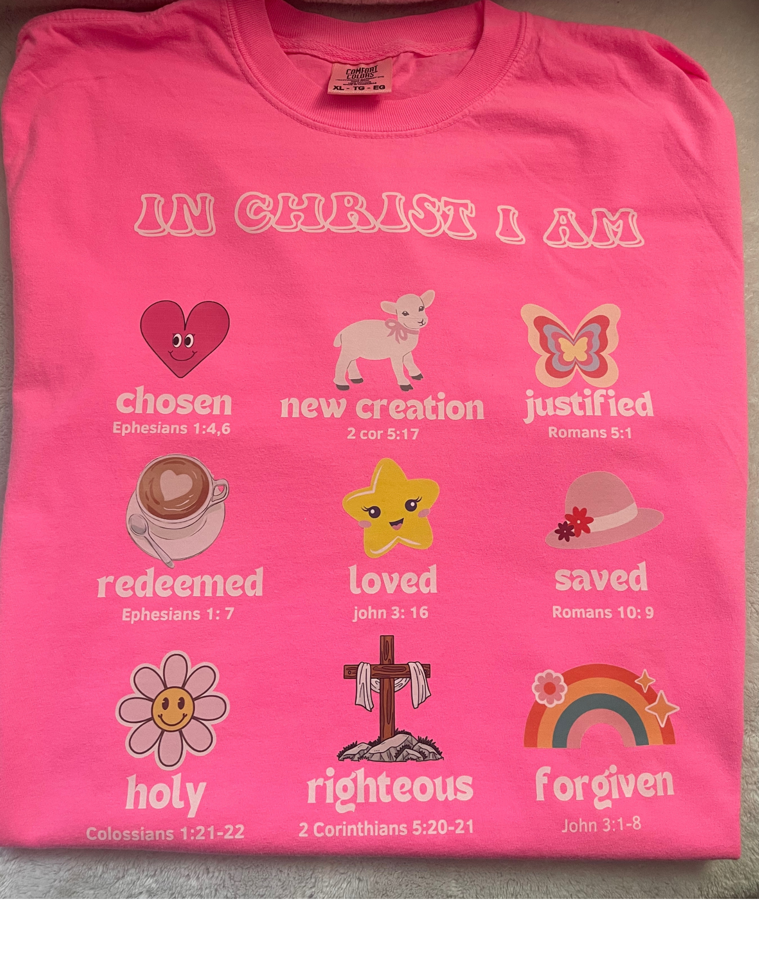 Wear a bold declaration of your identity in Christ with our "In Christ, I Am" T-shirt. Inspired by Scripture, this design reminds us of the truth that in Him, we are chosen, redeemed, loved, forgiven, and new creation. Made from soft, high-quality fabric, this tee is perfect for daily wear and a powerful way to share your faith wherever you go.